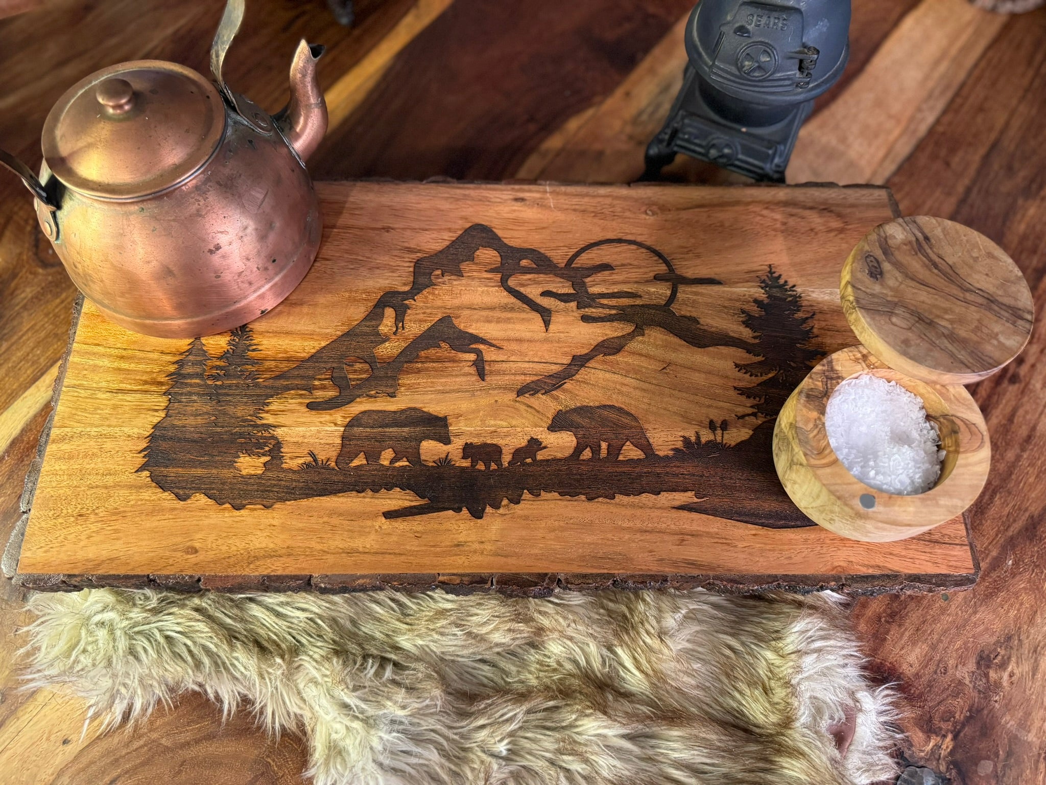 Bear Family in Mountains Live-edged Footed Board